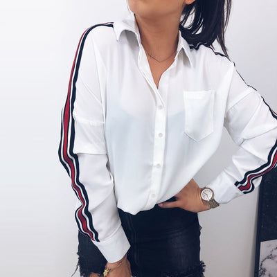 Blouse Women Casual White Stripe Long Sleeve Botton Shirt